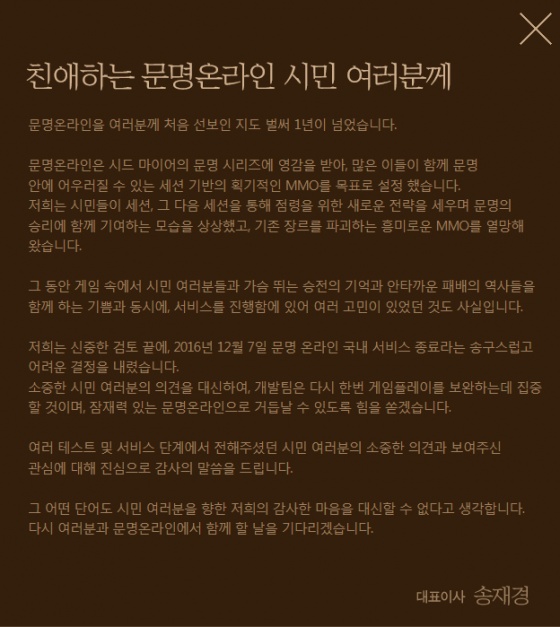 엑스엘게임즈는 금일(2일) 문명 온라인 공식 홈페이지에 송재경 대표의 편지와 함께 문명 온라인의 국내 서버 종료 사실을 알렸다.