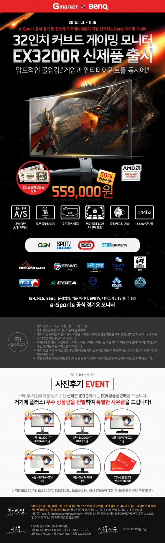 한편 벤큐는 EX3200R Eye-Care 제품 출시를 기념해 온라인 오픈마켓 지마켓에서 단독 런칭 행사를 시행한다. 11월 4일부터 진행되는 이번 런칭 행사는 행사 기간 중 지마켓을 통해 EX3200R 제품을 50대 한정으로 판매하며, 해당 제품을 구매한 모든 고객에게 문화상품권 2만원 권을 추가 증정하는 행사이다. 벤큐는 이번 EX3200R 런칭 행사와 더불어 11월 벤큐 모니터를 구매한 고객 중 자신의 블로그, SNS, 커뮤니티, 온라인 쇼핑몰 등의 사이트에 간단한 포토 상품평을 작성한 선착순 100명에게 CGV 티켓 2매를 증정하며 우수 사용기를 작성한 5명의 소비자에게는 BL3201PT, BL3200PT, EW2750ZL, EW2440ZH, GW2470H 등 벤큐의 아이케어 모니터를 추가로 증정한다.