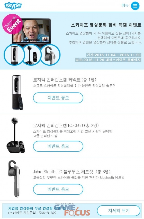또한, 11월 30일까지 진행되는 '스카이프 기업 영상통화 무료컨설팅' 이벤트는 영상통화 도입을 검토하는 모든 기업을 대상으로 진행된다.