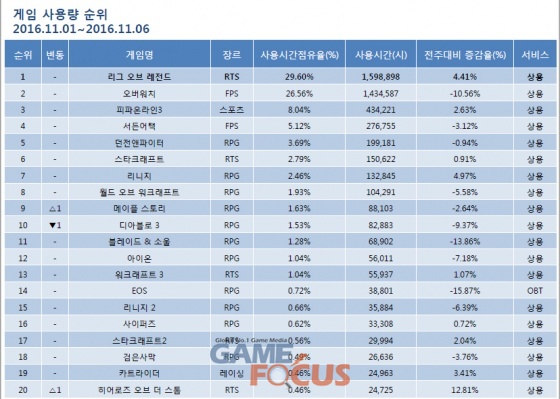 (주)미디어웹이 제공하는 '게임트릭스 주간 종합 게임 동향(2016.11.01~2016.11.06)에 따르면 지난 주부터 '오버워치'를 PC방 점유율 약 3% 차이로 따돌리고 다시 1위에 랭크 중인 '리그 오브 레전드'의 경우 전주 대비 PC방 사용량이 4.41%증가했다. 한동안 '오버워치'의 독주를 막지 못했지만 이번 롤드컵이 진행됨에 따라 그 영향을 받은 것으로 보인다.