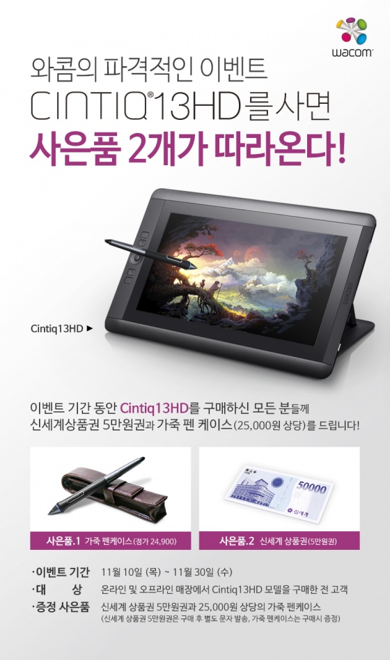 와콤(Wacom)의 한국법인 한국와콤(대표 김주형)은 오는 30일까지 펜 디스플레이 제품인 'Cintiq13HD(신티크13HD)' 구매자를 대상으로 다양한 사은품을 증정하는 프로모션을 실시한다.