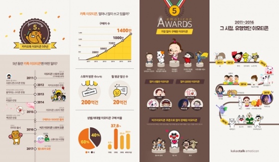 카카오(대표 임지훈)가 이모티콘 스토어의 오픈 5주년을 기념해 카카오톡 이모티콘의 성장 과정 이모티콘 판매 트렌드 등을 인포그래픽으로 공개했다.