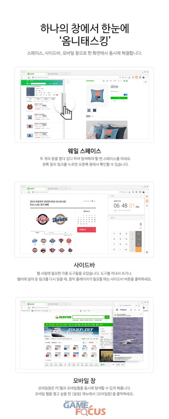 생활환경지능(Ambient Intelligence) 프로젝트의 일환으로 선보인 웨일은 여러 창(TAB, 탭)을 띄우지 않고, 하나의 창 안에서 모든 작업을 해결할 수 있도록 하는 '옴니태스킹' 기능이 핵심이다.