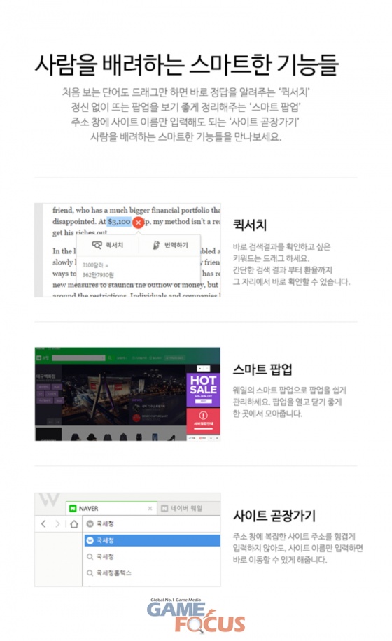 웨일은 브라우저 속 특정 단어를 드래그 하면 검색 결과가 팝업으로 뜨는 '퀵서치' 기능을 제공하고, 파파고에 적용된 인공신경망 기반의 번역 기술을 통해 영어, 중국어 등 외국어로 된 페이지를 번역해 준다. 이미지 형태의 텍스트에 대해서도 영역을 선택해 번역할 수 있다.