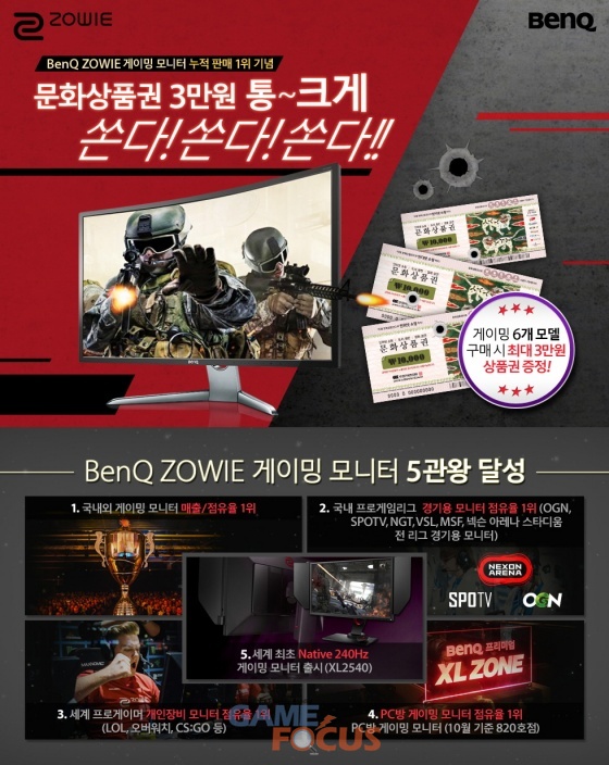 벤큐의 공식 모니터 수입원 피치밸리(대표 정재윤)와 함께 진행하는 이번 이벤트는 오는 12월 7일부터 12월 22일까지 벤큐 조위의 게이밍 모니터 6종 제품(XR3501, XL2735, XL2730, XL2720, XL2430, XL2411)을 구매하고 구매영수증과 시리얼 번호를 벤큐에 제공하면 XL2411, XL2430, XL2720 제품은 2만 원권, XL2730, XL2735, XR3501은 3만 원권의 모바일 문화상품권을 제공하는 행사다.