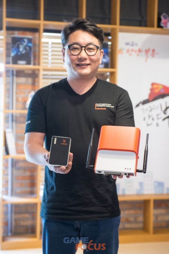 자체 개발한 IoT 디바이스 위콘(WICON)을 들고 있는 울랄라랩 강학주 대표