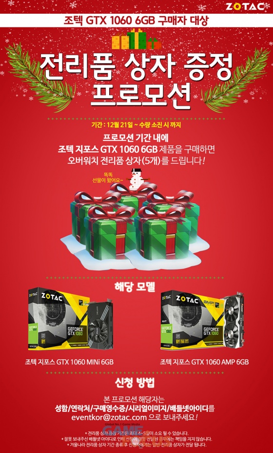 eventkor@zotac.com 으로 보내면 된다. 아이템을 수작업으로 전송해야 하기 때문에 전달하는데 최대 4~5일이 걸릴 수 있으며, 12월 28일 혹은 수량 소진 시 자동 종료된다.