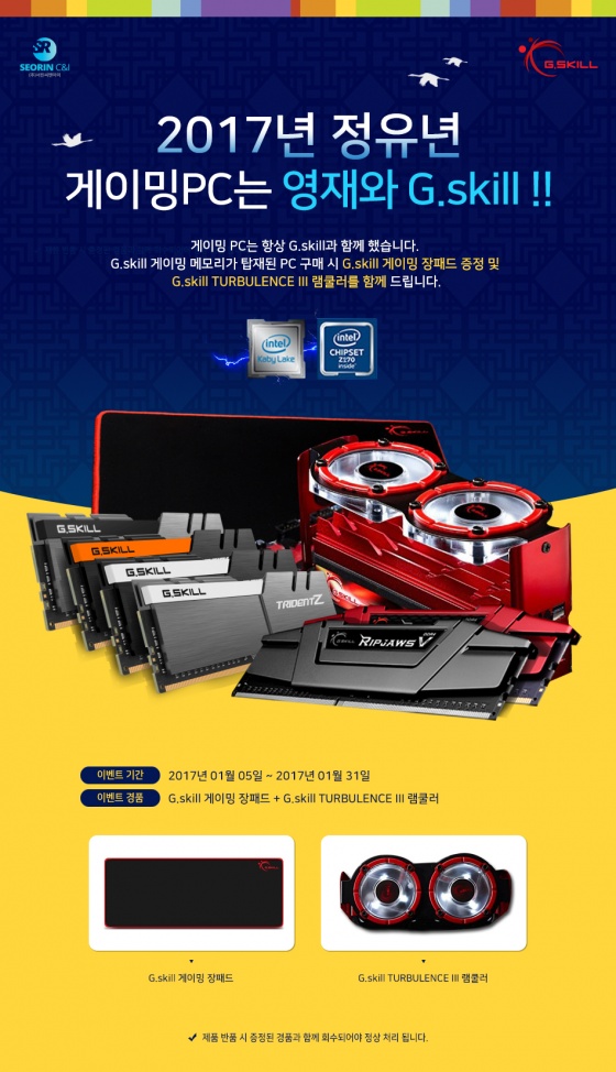 PC 구매 시 지스킬 로고가 새겨진 게이밍 장패드 증정 및 PC 내부에 '지스킬 터뷸런스 Ⅲ 메모리 쿨러'를 무상 장착하여 출고한다.