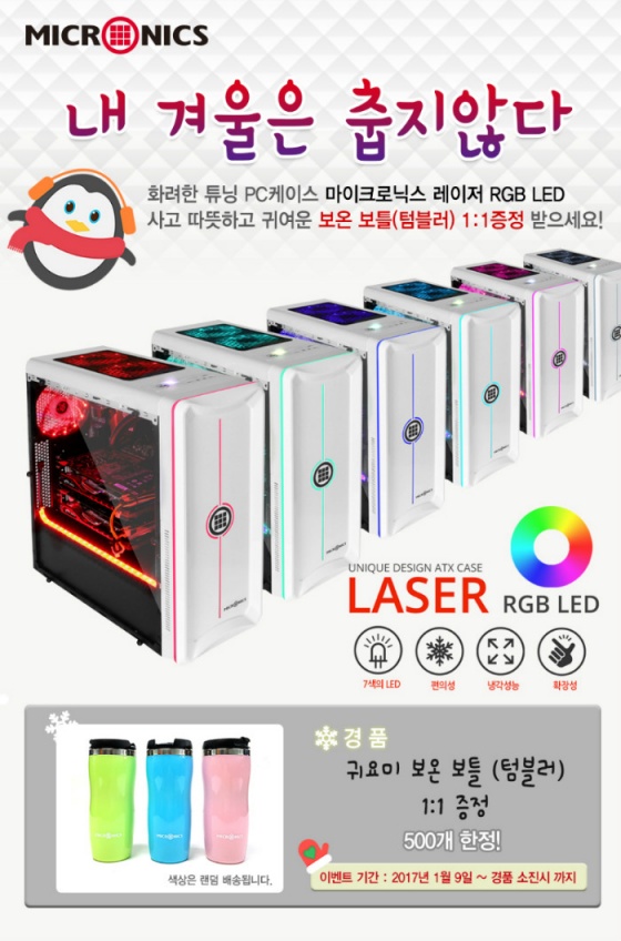 한미마이크로닉스(대표: 강현민, 이하 마이크로닉스)가 LED 튜닝 PC 케이스 '마이크로닉스 레이저 RGB LED' 제품 구매 시 텀블러 증정 행사를 진행한다.