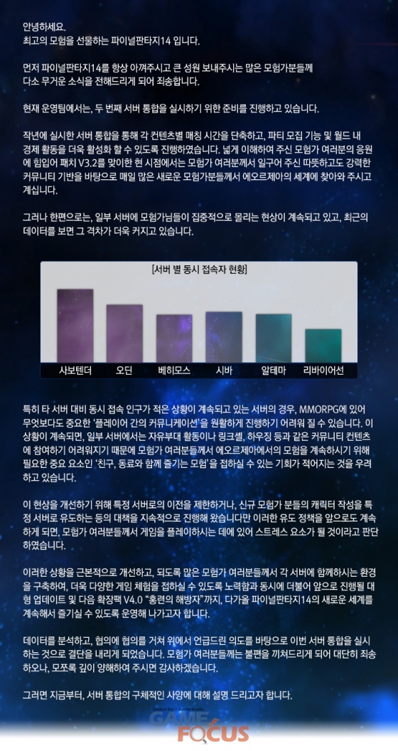 파이널판타지14를 서비스하고 있는 아이덴티티모바일은 지난 9일 공지를 통해 "일부 서버의 모험가(유저)들이 집중적으로 몰리고 있는 현상이 계속되고 있고 최근에는 그 격차가 더욱 커져 인구가 적은 서버에서 '링크셸', 하우징 등과 같은 커뮤니티 콘텐츠 참여가 어렵게 됐다"며, "이런 현상을 개선하기 위해 특정 서버로의 이전을 제한하거나, 신규 모험가의 캐릭터 생성을 특정 서버로 유도하는 등의 대책을 지속적으로 진행했지만 이런 유도 정책이 계속되면서 모험가들에게 스트레스 요소가 될 수 있다고 판단했다. 이러한 상황을 근본적으로 개선하고 되도록 많은 모험가들이 각 서버에 함께하는 환경을 구축, 더욱 다양한 게임 체험을 접할 수 있도록 서버 통합을 진행한다"며 일부 서버를 통합하겠다고 밝혔다.