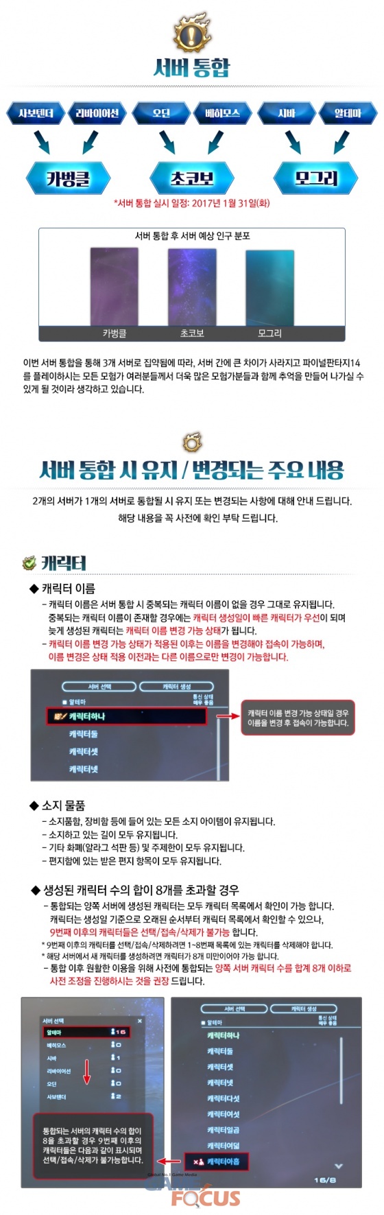 이번 서버통합 결정으로 인해 오는 31일부터 그동안 감옥 서버라고 불렸던 '리바이어선'을 비롯해 '사보텐더'는 '카벙클' 서버로 '오딘'과 '베히모스'는 '초코보', '시바'와 '알테마'는 '모그리'로 각각 통합된다.