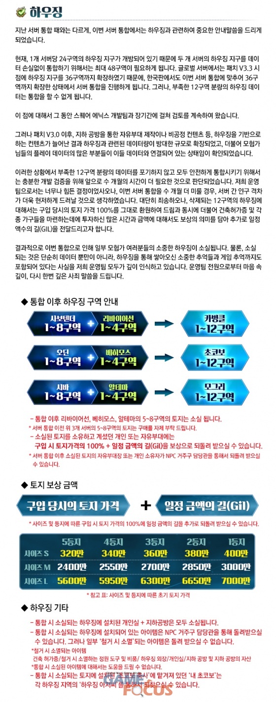 이로 인해 서버 통합 시 사보텐더, 오딘, 시바는 8개의 구역의 토지는 새로운 서버에 이전되나 리바이어선, 베히모스, 알테마의 5~8구역의 토지는 이전되지 않고 구입 당시의 토지 가격과 일정 금액의 길(Gil)로 보상될 예정이다.