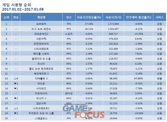 한편, 게임트릭스 순위 1위에서 10위까지의 게임들은 전주와 비교해 순위 변동이 없는 것으로 나타났지만 '서든어택', '메이플스토리', '리니지'를 제외한 나머지 게임들은 모두 전주대비 PC방 사용량이 감소했다. 가장 크게 감소한 게임은 '피파온라인3'로 전주대비 PC방 사용량이 15.55% 감소했다.