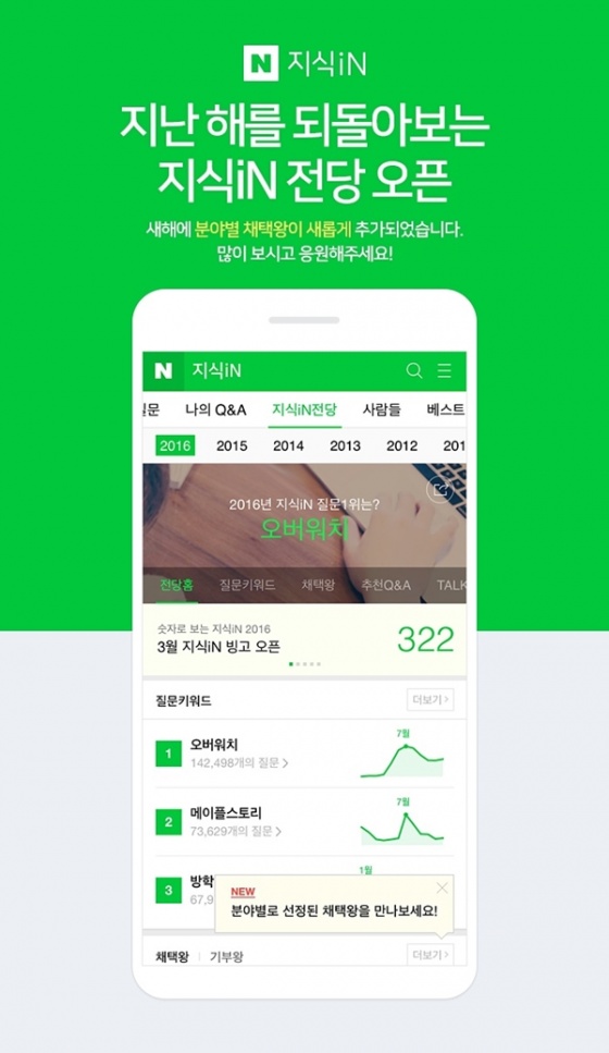 네이버 지식 공유 플랫폼 '지식iN'이 지식iN의 히스토리를 한데 모아 제공하며 지난 한 해를 추억하고 기념할 수 있는 '2016 지식iN 전당'을 오픈했다.