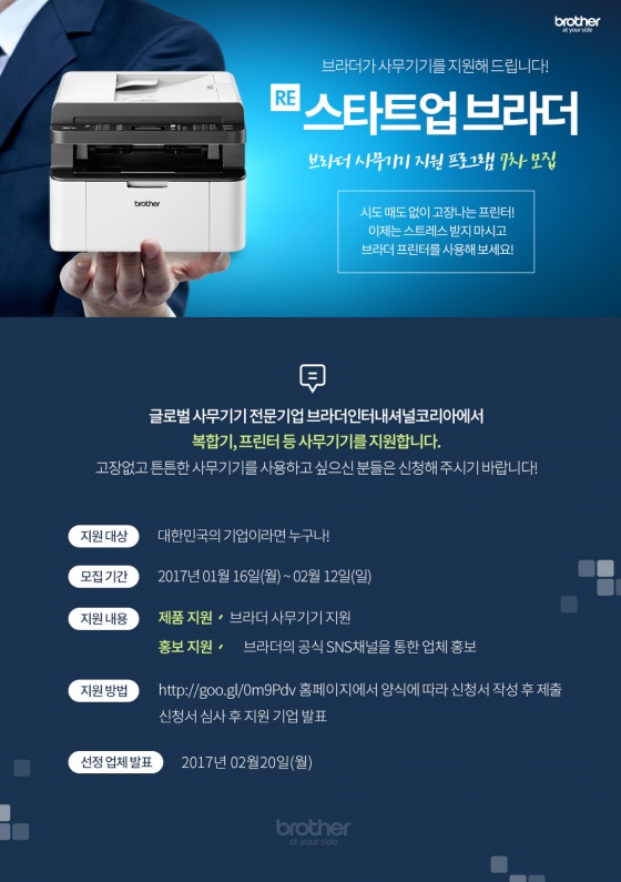 브라더는 신청서를 바탕으로 해당 기업의 성장 가능성, 사무기기 제품의 활용도, 비즈니스에 대한 신념과 열정 등을 종합적으로 평가하여 2월 20일(월), 브라더 공식 블로그 및 페이스북을 통해 발표할 예정이다. 선정 기업은 업무 니즈에 맞는 브라더 제품군을 무상으로 지원받을 수 있으며, 브라더의 공식 블로그와 페이스북을 통한 기업 홍보 기회도 얻게 된다.