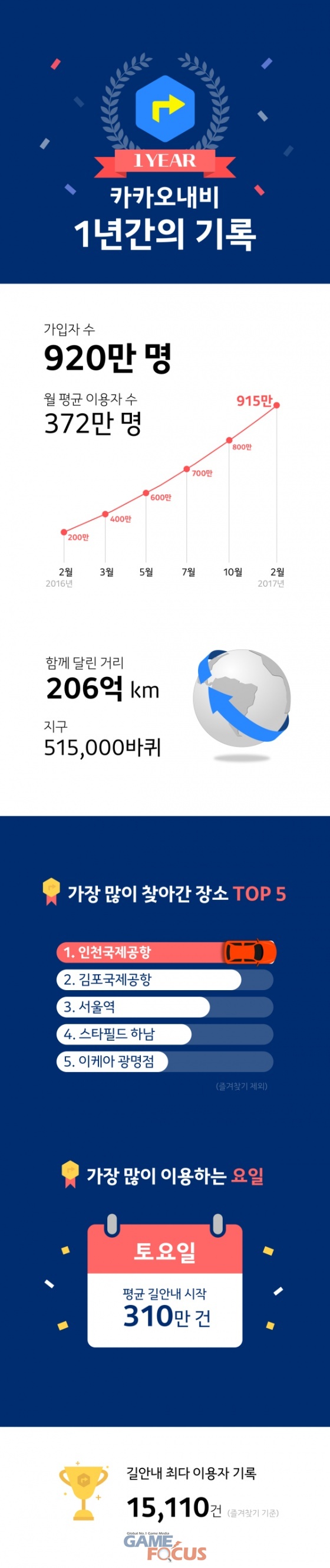 지난 1년간 카카오내비 이용자들이 길 안내를 실행한 횟수는 총 7.3억번, 카카오내비를 이용해 달린 거리는 206억km에 달했다. 이는 지구를 약 51만 5천번 돌 수 있는 거리며, 지구와 태양을 약 70번 왕복할 수 있는 거리다.