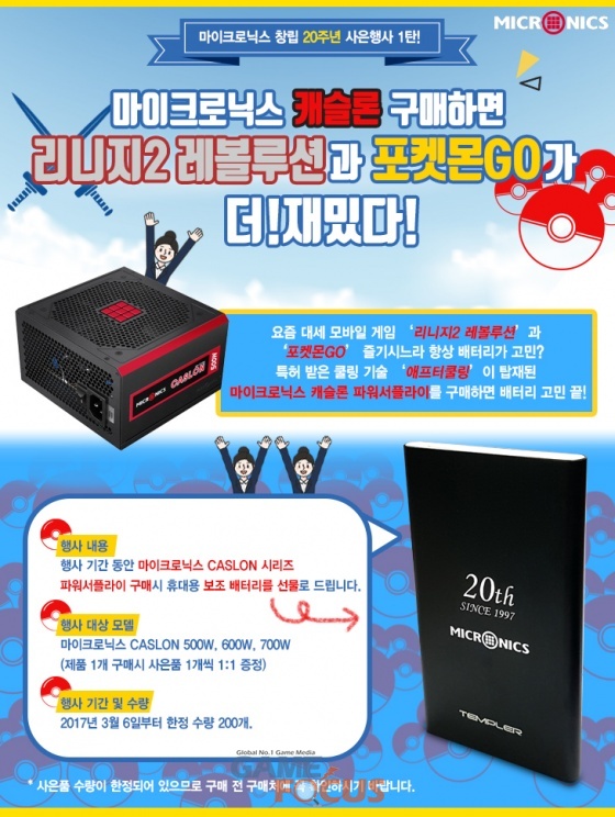 이번 증정 행사는 올해로 창립 20주년을 맞은 마이크로닉스의 2017년 연속 사은 행사의 1탄으로 기획됐다. 행사 대상 제품은 특허 받은 쿨링 기술인 ‘애프터쿨링(특허 등록 제10-1564428호)’이 적용된 캐슬론 500W, 600W, 700W 세 제품으로, 제품 구매시 휴대용 보조 배터리를 1:1로 증정한다. 증정품인 휴대용 보조 배터리는 최근 ‘리니지2 레볼루션’, ‘포켓몬GO’ 등, 모바일 게임의 인기로 스마트폰 배터리 소모가 늘어난 것을 고려해 야외에서도 여유 있게 게임을 즐길 수 있게 해주는 유용한 사은품이 될 전망이다.