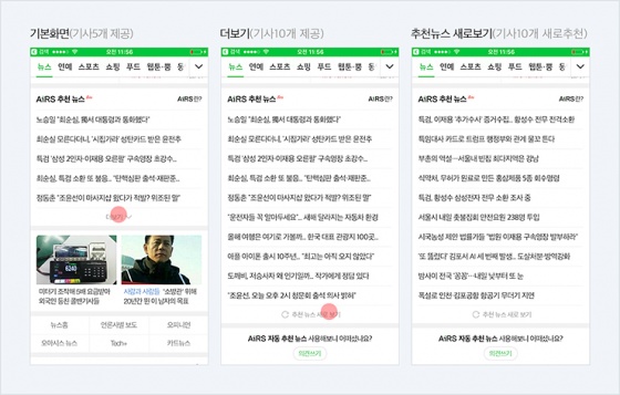 AiRS는 이용자의 관심사, 콘텐츠 소비 패턴 등을 분석하여 이에 따른 콘텐츠를 자동으로 추천하는 인공지능 시스템이다. MY피드와 네이버TV에 이어, 올 2월 모바일 메인 <뉴스판>으로 적용 범위를 확대해 'AiRS 추천 뉴스' 베타 버전을 제공하고 있다.