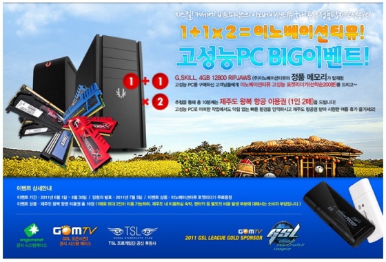 완제 조립 PC 전문 판매몰인 오마이피씨(http://www.omypc.co.kr 대표: 정현철)는 세계적 명성의 고성능 메모리 제조사인 G.SKILL (지스킬), CORSAIR (커세어), BITFENIX (비트피닉스)의 국내 공식 유통사인 ㈜이노베이션 티뮤 (http://www.timu.co.kr 대표: 이광재)에서 유통하는 공식 정품이 탑재된 완제품 PC를 구매할 경우 자동 응모되는 이벤트를 진행한다고 밝혔다.