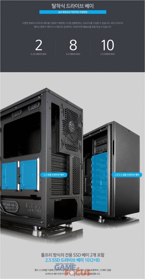 이 외에도 툴 프리 방식의 전용 SSD 베이 2개 포함 총 10개의 2.5'인치 드라이브 베이 및 3.5 인치 HDD 베이 8개를 제공하며, 5.25인치 ODD 베이 2개를 제공하는 등 높은 확장성을 갖추고 있다. 3단계로 쿨링팬 속도 조절을 할 수 있는 내장 팬 컨트롤러도 기본 탑재되어 있다.