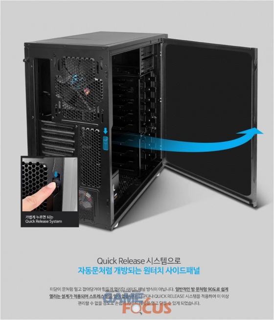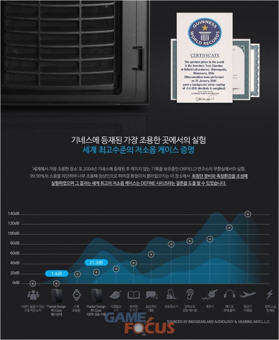 또한, 양 사이드 패널 모두 차음재를 적용해 극 저소음을 지향하고 있으며, 무게감 있는 스틸 프레임과 두꺼운 사이드패널에 차음재를 사용해 PC 구동 시 발생하는 소음과 진동을 최소화한 것도 특징. 세계에서 가장 조용한 장소로 기네스에 등재된 ORFIELD 연구소의 소음차단 실험을 통해 낙엽 밟는 소리보다 낮은 21.2 db 수준의 저소음을 실현한 제품이다.