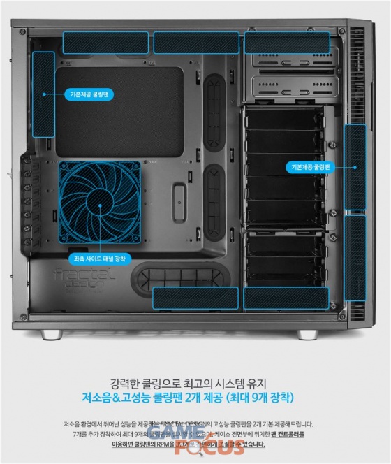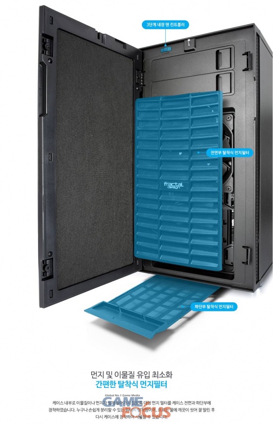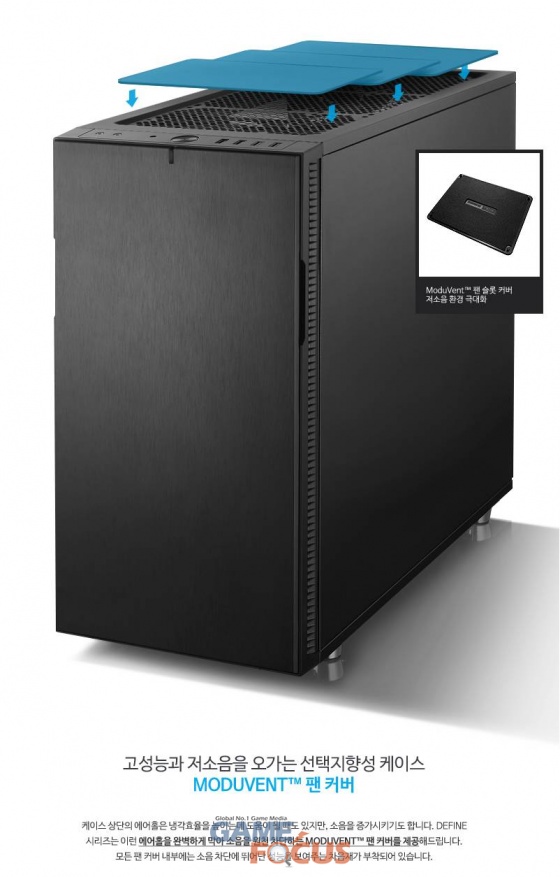 또한, 케이스 상단의 에어홀은 냉각 효율을 높이는데 도움이 될 때도 있지만, 소음을 증가시킬 수 있어 이런 에어홀을 완벽하게 막아주는 차음재를 적용한 Modvent 팬 커버를 제공하며, 케이스 전면 및 하단에 탈착 식 먼지 필터를 적용해 외부로부터의 이물질을 최소화 하고 청소 또한 용이하다.