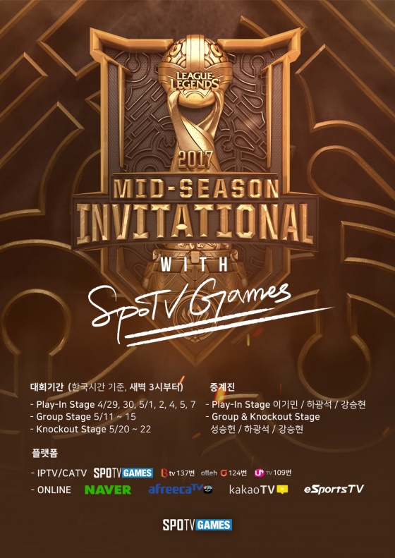 브라질에서 진행되는 상반기 최대 LoL 축제 '2017 MSI'는 '2017 LCK Spring' 우승 팀 'SK telecom T1'을 비롯해 전세계 13개 리그의 스프링 시즌 우승 팀이 출전하며, 스포티비 게임즈는 '그룹 스테이지'에 직행하는 한국과 중국, 유럽을 제외한 10개 리그 팀 경기인 '플레이-인 스테이지' 경기를 단독 생중계할 예정이다.