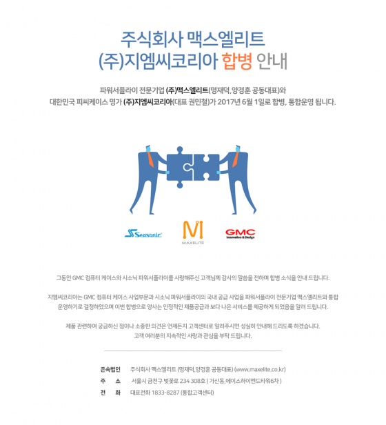 PC 파워 서플라이, PC 케이스 등으로 유명한 (주)지엠씨코리아(대표 권민철, 이하 지엠씨)와 작년부터 파워 서플라이 시장에 돌풍을 일으키고 있는 파워 서플라이 전문기업 (주)맥스엘리트(명재덕·양경훈 공동, 이하 맥스엘리트)가 기업합병을 통해 PC 시장의 강자로 발돋움할 태세다. 맥스엘리트는 오는 6월 1일부터 지엠씨와의 통합을 통해 제품 라인업의 확대와 고객 서비스 개선에 나선다.