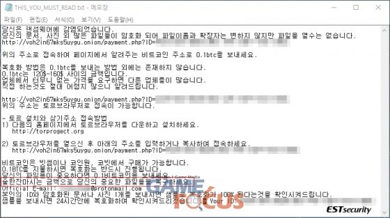 또한 랜섬웨어에 의한 암호화 과정이 모두 완료되면 바탕화면 등에 'THIS_YOU_MUST_READ.txt' 이름의 랜섬노트 파일이 생성되고, 암호 해독(복호화)을 위해 0.1 비트코인을 요구하는 한국어 안내를 보여준다.