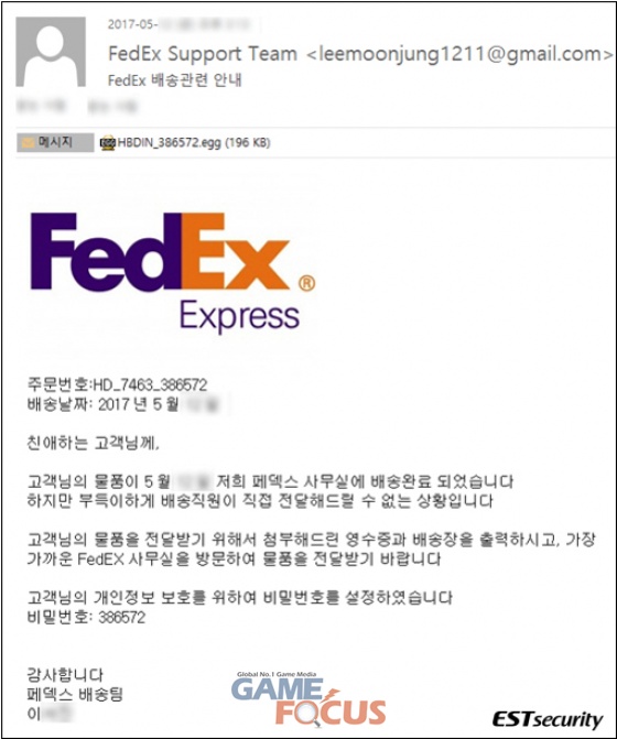 글로벌 특송 업체인 페덱스(FedEx)의 배송 안내로 위장한 이번 이메일은 'leemoonjung1211@gmail.com'이라는 계정으로 'FedEx Support Team'을 사칭하여 발송되었고, 일부 고객 피해 사례 등도 접수되고 있어 각별한 주의가 필요한 상태이다.