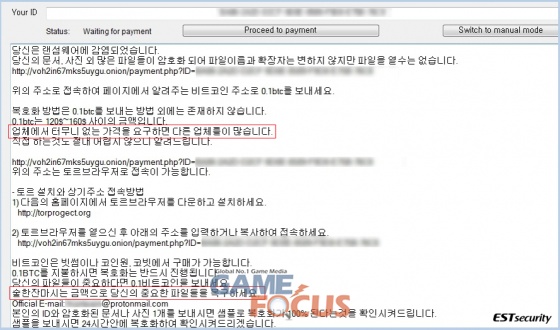 특히 이번 랜섬웨어는 수사기관의 추적을 피하기 위해 토르(Tor) 웹 브라우저로만 접속 가능한 다크 웹(Dark Web) 주소를 사용하였으며, 랜섬노트 내용에 '술 한잔 마시는 금액으로 당신의 중요한 파일들을 복구하세요.'라는 유창한 한국어 표현이 사용된 문구가 포함되어 있다.