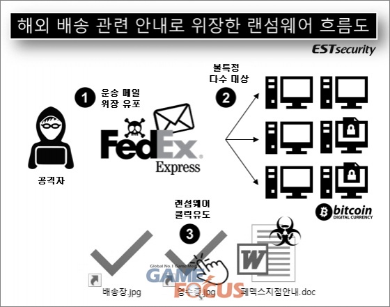 만약 수신자가 육안상 실행 파일이 아닌 것에 안심하거나 이미지(.jpg) 파일로 위장된 바로가기 파일에 현혹되어 '배송장.jpg' 파일이나 '영수증.jpg' 파일을 실행할 경우, 바로가기 내부 명령어에 의해 '페덱스지점안내.doc' 파일이 자동으로 실행되고 그 즉시 랜섬웨어에 감염된다.
