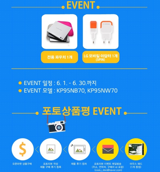 이번 6월 1일부터 진행하는 630 DAY 핫 딜 이벤트는 모바일 DVD 플레이어 'KP95NB70', 'KP95NW70' 제품과 외장 ODD 'GP50NB40', 'GP50NW40', 'GP60NS50', 'GP60NB50', 'AP60NB60', 'KP65NW70', 'KP65NB70' 제품 구매 시 전용 파우치, 공 DVD 미디어 10장을 6월 30일까지 증정 한다.