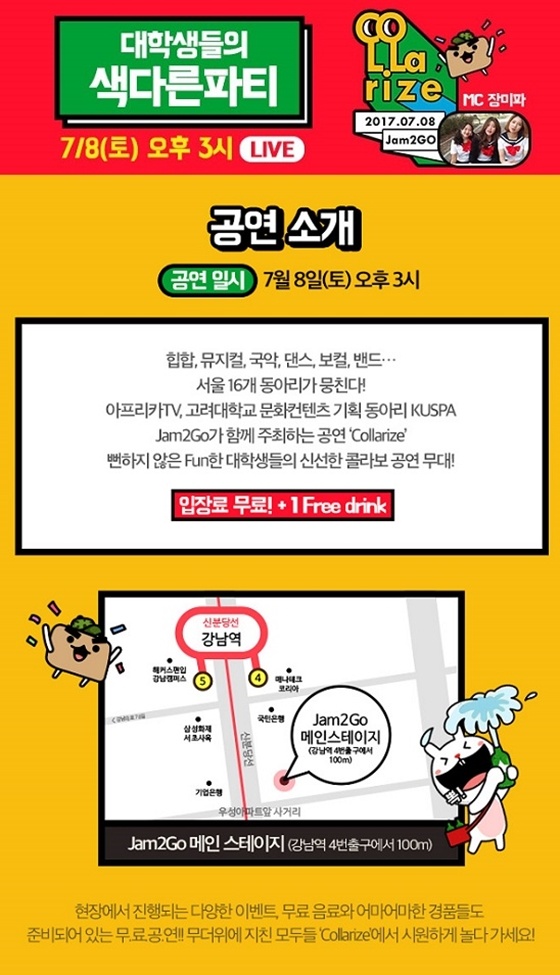 이번 축제는 서울대와 고려대 등 10개 대학에서 활동중인 16개 공연 동아리들이 참여한다. 대학생들은 '색채를 입히다(Colorize)'와 공동작업(Collaboration)'을 합쳐 만든 신조어 '컬러라이즈(Collarize)'라는 이름을 걸고 힙합, 어쿠스틱 밴드, 춤, DJ, 오케스트라 등 성격이 다른 장르들을 섞어 새로운 공연을 펼칠 예정이다. 8일 오후 3시부터 강남역 잼투고(Jam2Go)에서 무료 축제로 열리고, 선착순 250명에게는 무료 음료 쿠폰도 제공한다. 온라인에서는 아프리카TV로 볼 수 있다.