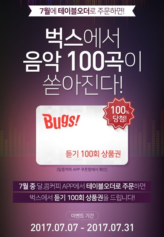 이번 달콤커피와의 제휴 이벤트는 31일까지 진행한다. 달콤커피를 APP 내 테이블오더로 결제하면 벅스 음악 듣기 100회 이용권을 제공할 예정이다.