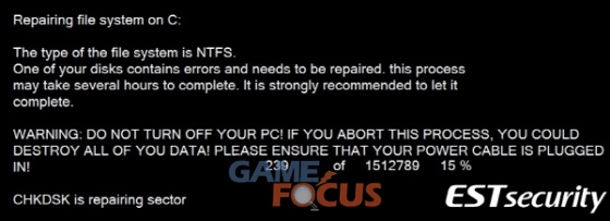 이번 악성파일이 실행되면 실제 페트야 랜섬웨어에 감염되었을 때와 흡사하게, 사용자의 하드디스크(HDD)에 문제가 발생해 파일 시스템(NTFS)을 수정하고 있는 것처럼 움직이는 화면을 보여준다.