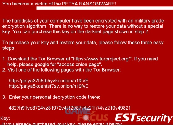 이 화면에서 사용자가 키보드로 문자를 입력을 할 경우 페트야 랜섬웨어에 감염되었다는 가짜 안내 문구가 나타나며, 특정 브라우저(토르, Tor)로만 접근할 수 있는 다크웹 주소로 사용자가 접속하도록 유도한다.
