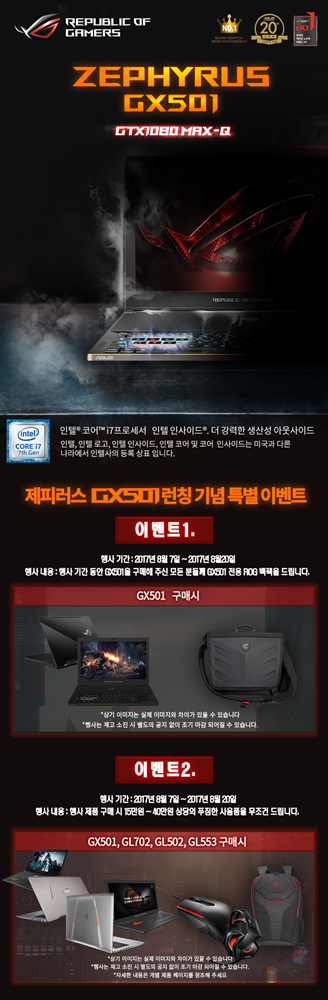 한편, ASUS는 제피러스 GX501 런칭을 기념해 온라인 마켓 11번가에서 게이머들은 위한 특별 프로모션을 실시한다. 오는 8월 20일까지 진행되는 이번 프로모션에서는 GX501 구매자 전원에게 ROG 전용 백팩을 증정한다. 또한, 같은 기간에 프로모션 대상 제품인 ▲GX501, ▲GL702, ▲GL502, ▲GL553 구매 시 15~40만원 상당의 사은품을 증정한다. 해당 이벤트는 재고 소진 시 마감될 수 있다