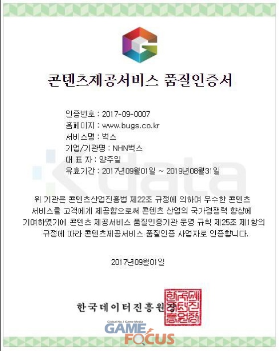 NHN벅스(대표 양주일)의 음악포털 '벅스'가 '2017 콘텐츠제공서비스 품질인증'을 획득했다.