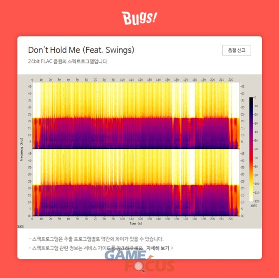 벅스는 자사에서 제공하는 24bit FLAC(Free Lossless Audio Codec) 고음질 음원의 스펙트로그램(spectrogram)을 미리 보여주는 기능을 신설했다. 스펙트로그램은 음원 파일을 분석해 시각화한 그래프 이미지로, 음원 품질을 판단할 때 주로 쓰인다. 벅스 홈페이지에서 24bit FLAC 구매 전 음원의 주파수 아이콘을 클릭하면, 전문 프로그램으로 정확히 분석된 스펙트로그램을 확인할 수 있다.