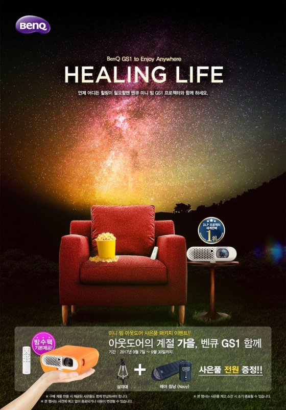 벤큐 코리아와 벤큐 휴대용 LED 프로젝터 공식 수입원 (주)오진상사(대표 승만호)가 함께 진행하는 이번 행사는 9월 7일부터 9월 30일까지 온라인 오픈마켓 11번가, 옥션, 지마켓과 소셜커머스 사이트와 위메이크프라이스, 쿠팡, 티켓몬스터에서 벤큐 GS1을 구매한 고객 전원에게 거치용 삼각대와 아웃도어용 빈슨메시프 레아 침낭을 함께 증정하는 행사이다.