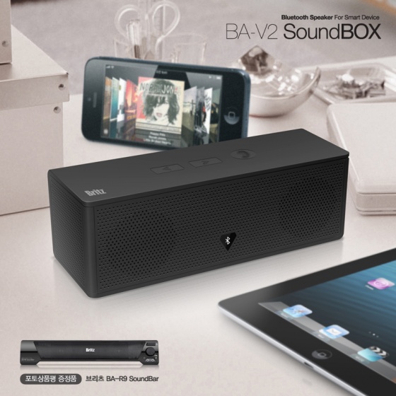 BA-V2 SoundBox는 정격 4W의 높은 출력으로 실내외에서 안정적으로 블루투스 무선 스트리밍을 즐길수 있으며 Bass Reflecting System을 통해 단단한 중저음 또한 느낄 수 있다. 제품 뒷면에는 TF카드 슬롯을 장착해 별도의 뮤직플레이어 없이 MP3파일 재생도 가능하다. 스마트폰과 연결시 통화기능도 제공하며 AUX단자를 통해 노트북 / PC와 연결도 가능하다.