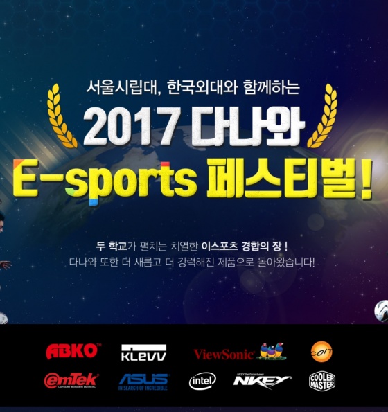 2017 다나와 E-Sports 페스티벌은 서울시립대와 한국외대가 함께하는 e스포츠 대회다. 11월 10일 오전 11시 30분부터 오후 8시까지 서울시립대 학생외관 앞 특설 무대에서 진행되며, 두 대학교가 오버워치, LoL 등 다양한 종목으로 겨루게 된다.