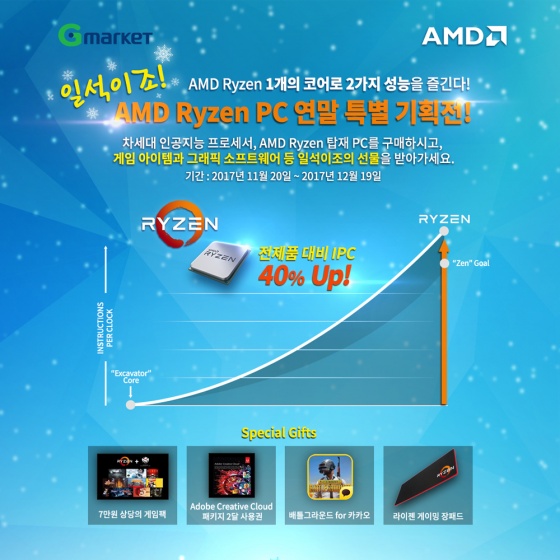 AMD코리아는 인터넷 쇼핑몰 G마켓과 공동으로 '라이젠(Ryzen)' 프로세서 탑재 브랜드 PC 연말 특별 기획전을 실시한다고 밝혔다. 다가오는 연말을 맞아, 라이젠 프로세서 기반의 PC 를 합리적인 가격에 제공하고자 마련된 이번 기획전은 오는 12월 19일까지 진행된다. 구매 고객 전원에게는 게임팩, 어도비 크리에이티브 클라우드(Adobe Creative Cloud) 패키지 등 풍성한 혜택을 제공한다.
