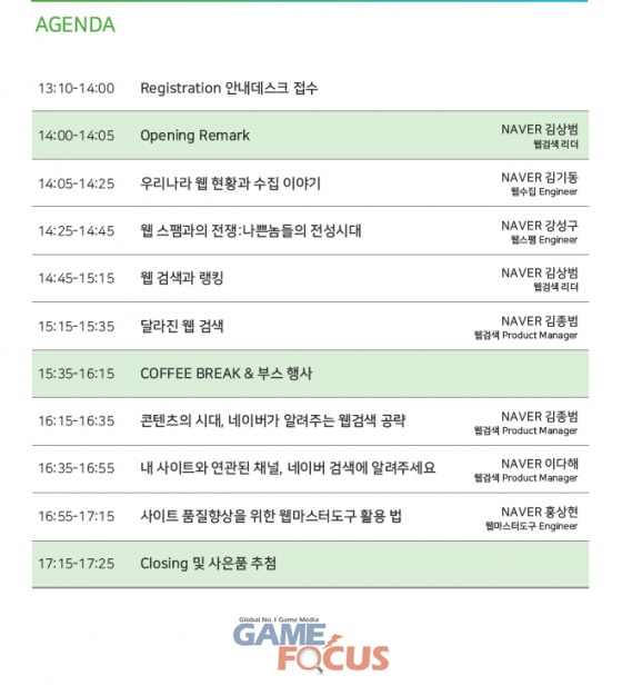 또한, '사이트 품질향상을 위한 웹마스터 도구 활용법', '콘텐츠의 시대, 네이버가 알려주는 웹검색 공략' 등 웹사이트 운영에 도움이 될 만한 유익한 정보들을 공유하는 세션과, 쉬는 시간 동안 웹사이트 운영자들이 궁금증을 해결할 수 있는 QnA 세션도 마련된다. 추첨을 통해 선정된 일부 사이트 관리자들에게는 네이버 실무진들이 일대일로 사이트 진단을 해주는 컨설팅 기회도 제공될 예정이다.