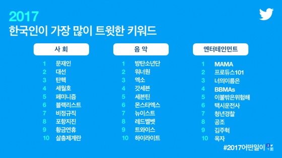 트위터는 2017년 한 해 동안 전세계 이용자들이 생성한 트윗과 계정들을 분석해 '#ThisHappend' '#2017어떤일이' 라는 해시태그와 함께 올해의 각종 트위터 기록들을 공개했다.