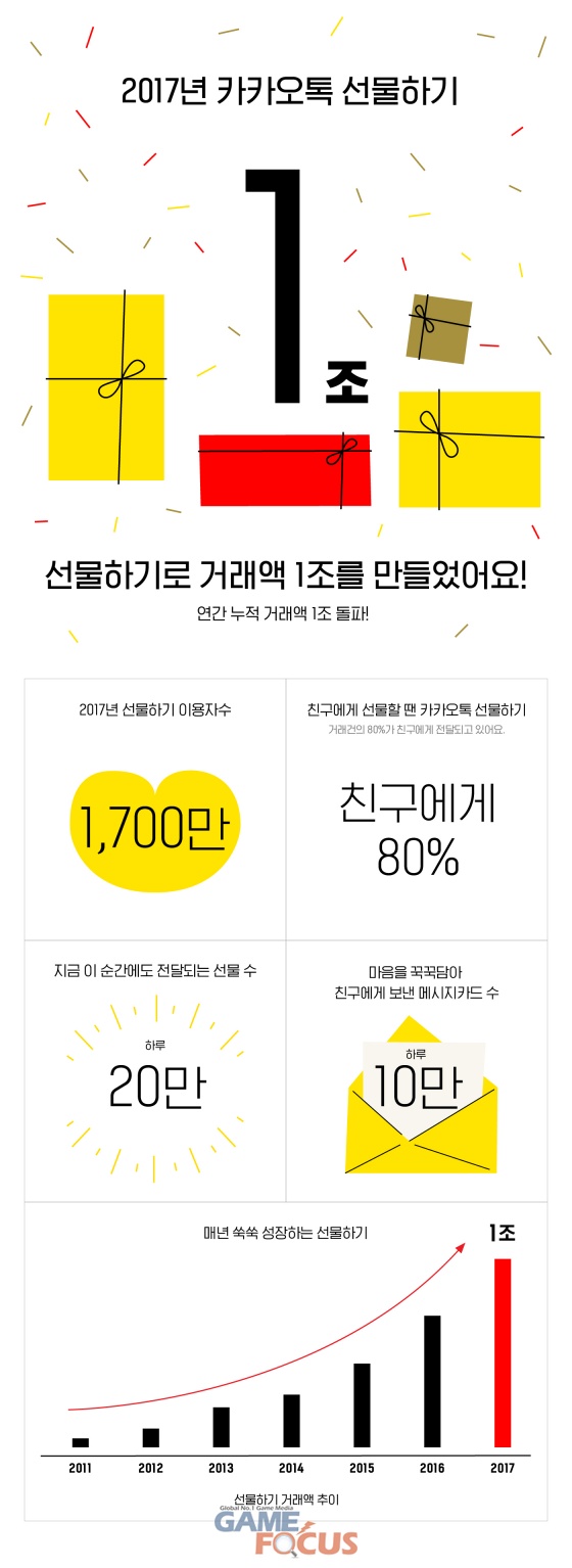 카카오에 따르면 올 한 해 1,700만명이 카카오톡 선물하기를 이용했으며, 1조원의 선물을 주고 받았다. 친구에게 선물을 보낸 비율이 80%에 달하며, 이 중 60%가 메시지카드에 마음을 담아 선물을 보냈다. 메시지카드는 선물을 보내는 사람이 고백, 축하, 감사의 마음을 담은 메시지를 전달할 수 있는 기능으로, 이용자가 마음에 드는 배경 화면과 카카오프렌즈 캐릭터를 선택해 카드를 꾸밀 수 있어 높은 이용률을 보이고 있다.