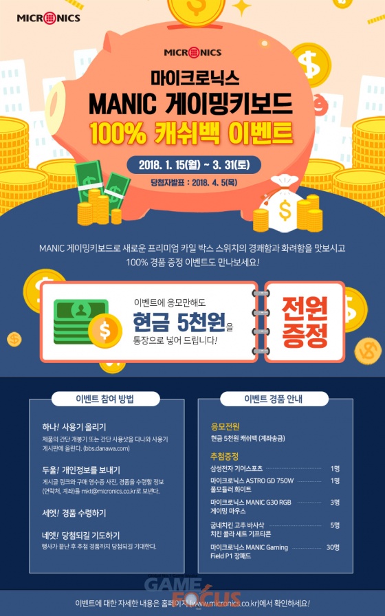 1월 15일부터 3월 31일까지 진행되는 이번 행사는 마이크로닉스의 게이밍 키보드 ‘MANIC K735 엣지 RGB 카일박스축’과 ‘MANIC K532 카일박스축’ 두 가지 모델을 대상으로 소비자가 제품을 구매하고 간단 개봉기나 사용기를 올리면 현금 5천원을 되돌려준다. 행사 기간 중 제품을 구매한 모든 사용자가 참여할 수 있으며, 참가자에게는 행사 종료 후 삼성전자 기어스포츠, 마이크로닉스 ASTRO GD 750W 풀모듈러 제품 등, 총 40명에게 추첨 경품을 추가 증정한다.
