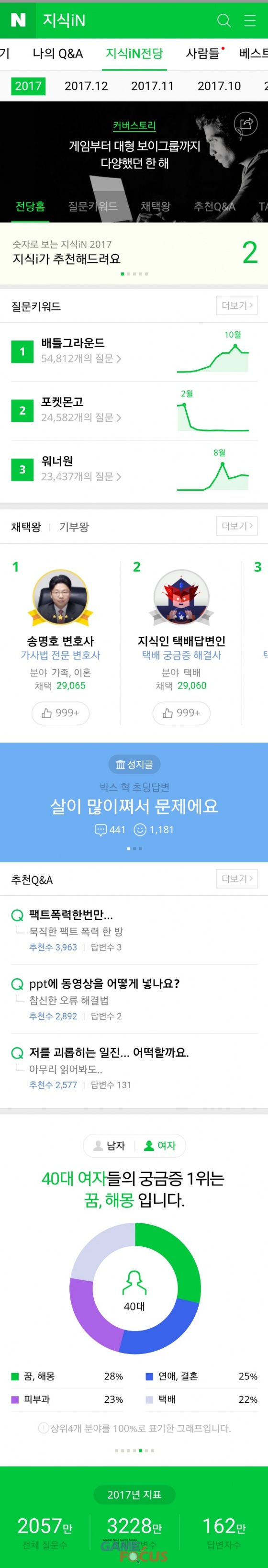 네이버 지식iN이 지난 한 해 동안의 질문 데이터를 결산한 '2017년 지식iN전당'을 오픈했다.