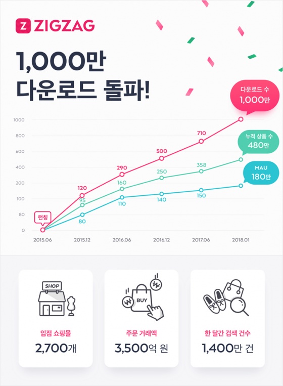 2015년 6월 서비스를 시작한 '지그재그'는 지난해부터 분기별로 평균 100만 이상의 다운로드를 기록하며 빠르게 성장해 왔다. 지난 달에는 월간 방문객(MAU)이 180만 명을 넘어서는 등 국내 여성 쇼핑 플랫폼 분야에서 독보적인 입지를 다져가는 중이다.